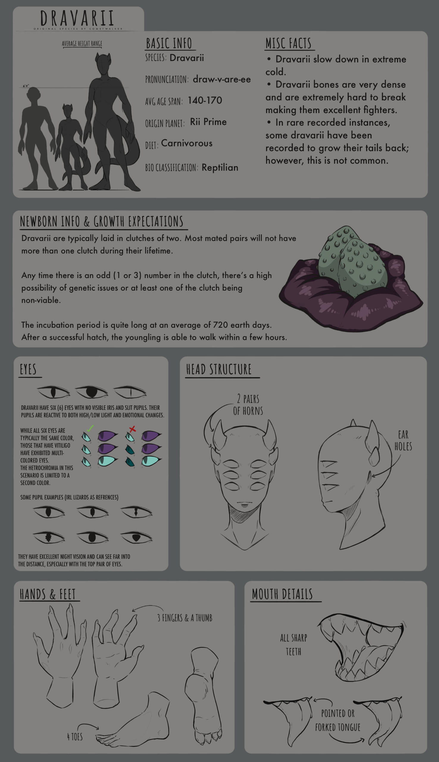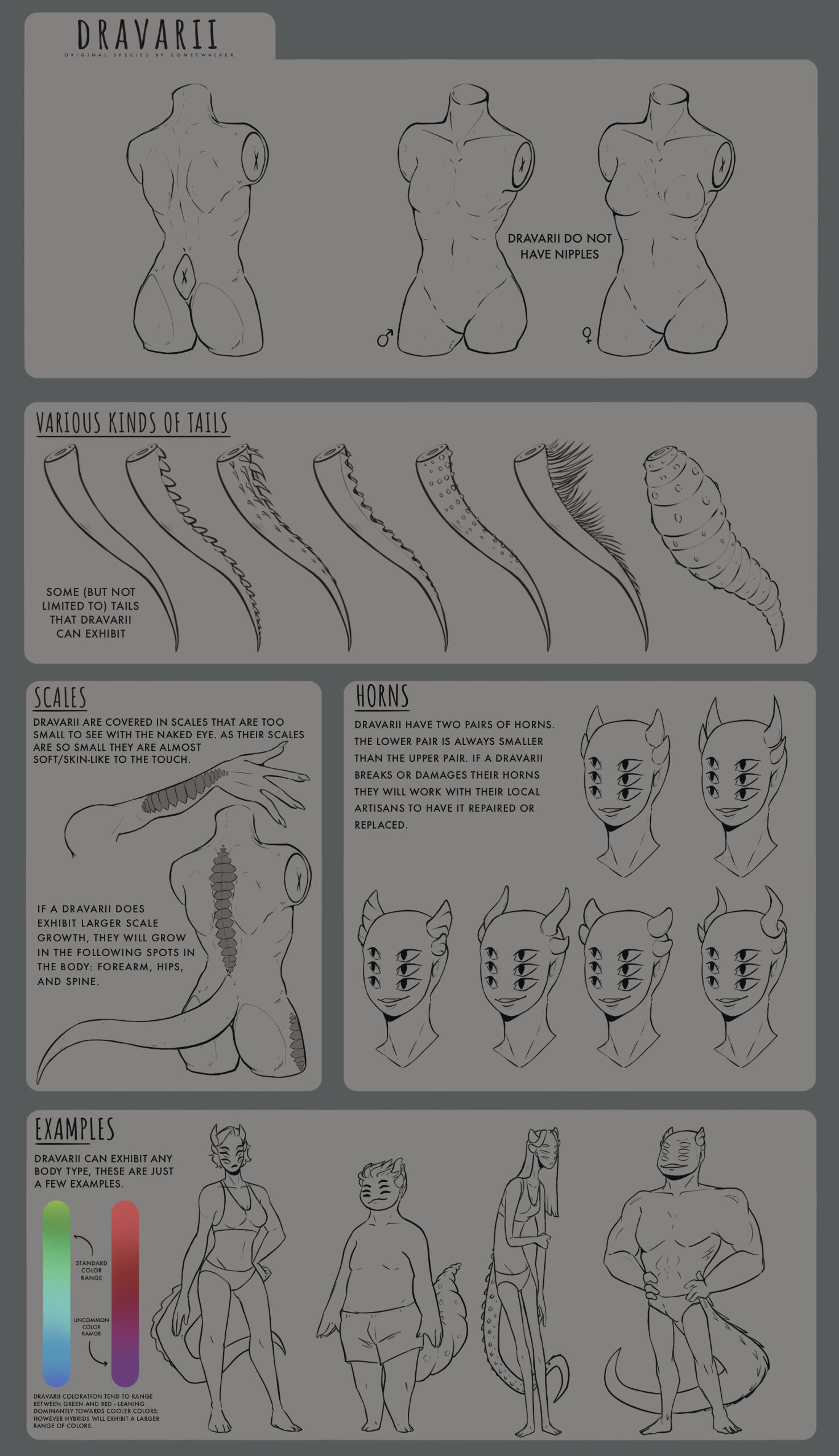 Dravarii aren't the most social species - not ones to go out of their way to be socialites by default. Many of them prefer to stick to the outskirts of larger cities, some running taverns, small inns, or shops. Those that do engage with others tend to find themselves in the science or similar sectors - allowing them to minimize their contact.Toyhouse